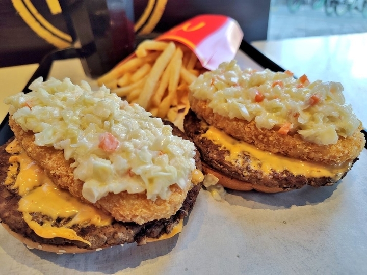 나만의 쿼파치 만들기 이벤트 참여 하려고 맥날에서 만들어 봤어요 제가 만든 방법은 오전 10시20분에 맥모닝 커피와 해쉬 브라운 두개 구입 후 10분 기다렸다가 버거 판매 시간인 10시 반에 더블 쿼터 파운드 치즈 세트와 코울슬로.케이준 소스를 주문 1.버거를 반으로 나눕니다 2.패티 위에 케이준 소스를 발라줌 3.그 위에 해쉬 브라운과 코울슬로를 얹어요 4.오픈 해쉬슬로 쿼파치 완성