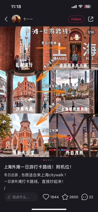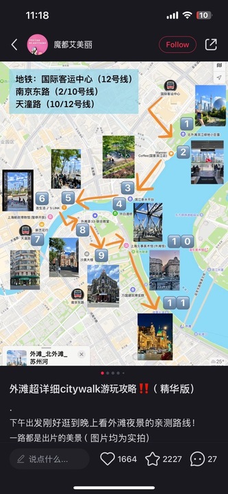 대 무비자 시대를 맞아 중국 여행을 고민중이신가요? 샤오홍슈 어플 깔고 <원하는 도시이름>+city walk라고 검색하면 친정한 중국인들이 이렇게 동선을 다 짜준답니다 뽈레앱의 장점은 먹는 것 외에도 리뷰를 남겨 다양한 곳에서 풍성한 경험이 가능하다는 것 같아요. 여행 가시려는 분들 참고하세요.
