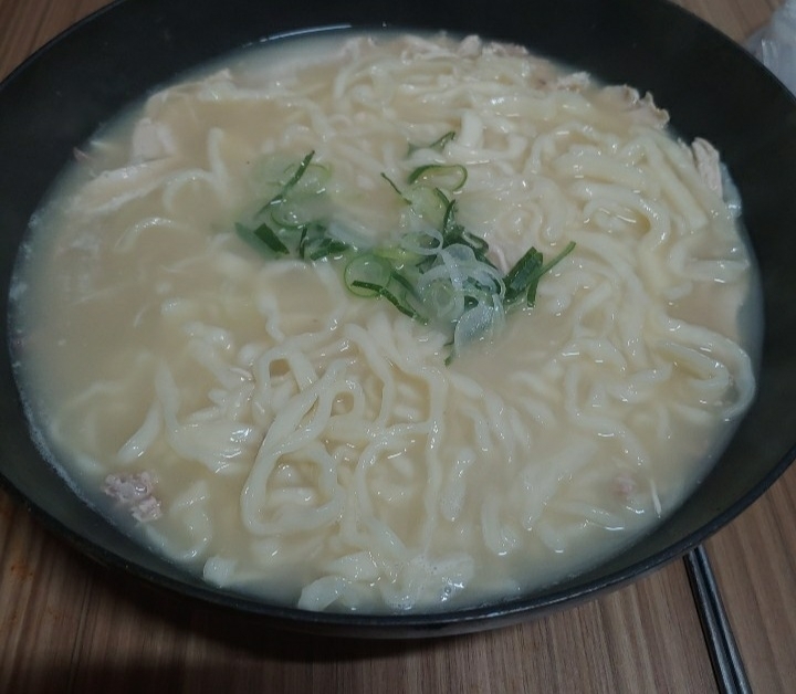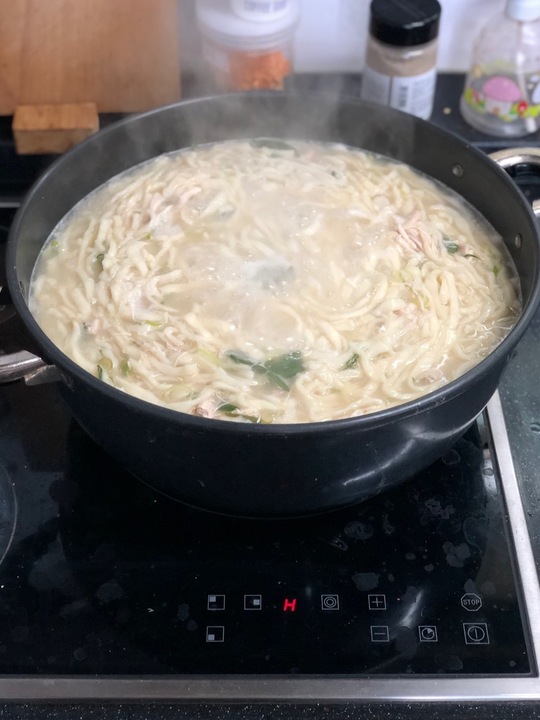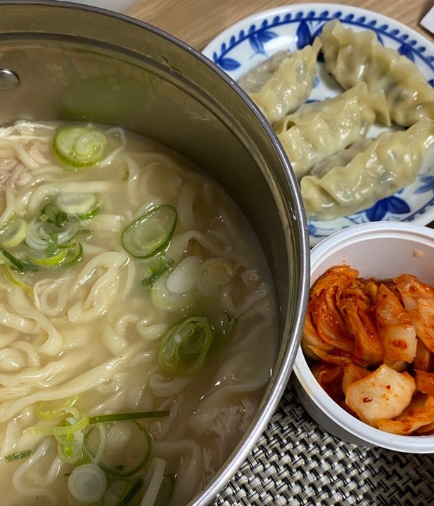 일산교자 밀키트 2인분이 기본이라 2인분을 샀다. 1인분이 거의 두 명이 먹을 수 있는 양이라 총 분량 4인분으로 봐도 무방함. (밥까지 말아 먹었을 때) 1팩 끓이면 보통 라면 두 개 끓인 분량이다. 일단 맛은 있음. 다만 식으면 약간 닭냄새가 나니까 그럴 땐 소금 후추 뿌려서 넣으면 좋다. 국물도 진하고 맛있고 면은 손칼국수라 좋고 고기 양도 적당함. 사실 손님 온다고 해서 시켰는데 안 오셔서 우리가 다 먹음.