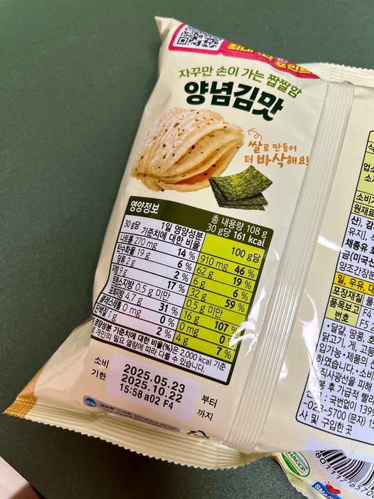오직 하나로마트에서만 만날 수 있는! 국산 쌀로 만든 꼬북칩 ‘양념김맛’입니다. 기존 꼬북칩에 비해 조금 더 라이트한 식감인데 자세히 보면 겹겹이 두께도 조금 얇은 편입니다. 김맛은 자극적이지 않았고 간장에 김 찍어 먹는 듯한 맛이 나서 신기했어요-!