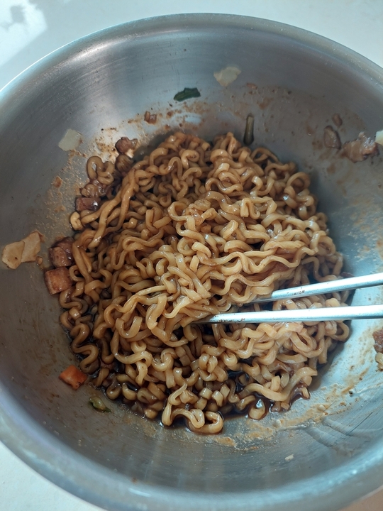 짜파게티랑 맛이 정말 거의 흡사해요! 이 점이 장점이기도, 단점이기도 합니다! 비건 라면이라서 향미가 부족하지 않을까 하는 염려는 지우셔도 좋습니다만 짜파게티(다른 짜장 라면과 다른) 특유의 인공적인 맛도 같이 나네요.